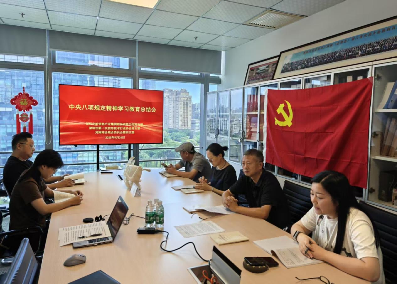 為全面總結(jié)近期中央八項(xiàng)規(guī)定精神學(xué)習(xí)教育工作開展情況,鞏固拓展學(xué)習(xí)成果,持續(xù)深化作風(fēng)建設(shè),2025年9月26日下午,我司黨支部聯(lián)合深圳市新一代信息技術(shù)行業(yè)協(xié)會黨支部、河南商會聯(lián)合委員會第四支部,共同召開了中央八項(xiàng)規(guī)定精神學(xué)習(xí)教育階段性總結(jié)會。會議以線上線下相結(jié)合的方式舉行,線下主會場設(shè)于我司九樓小會議室,線上通過騰訊會議平臺同步進(jìn)行。三方黨組織的全體黨員參加了此次意義深刻的總結(jié)交流活動。